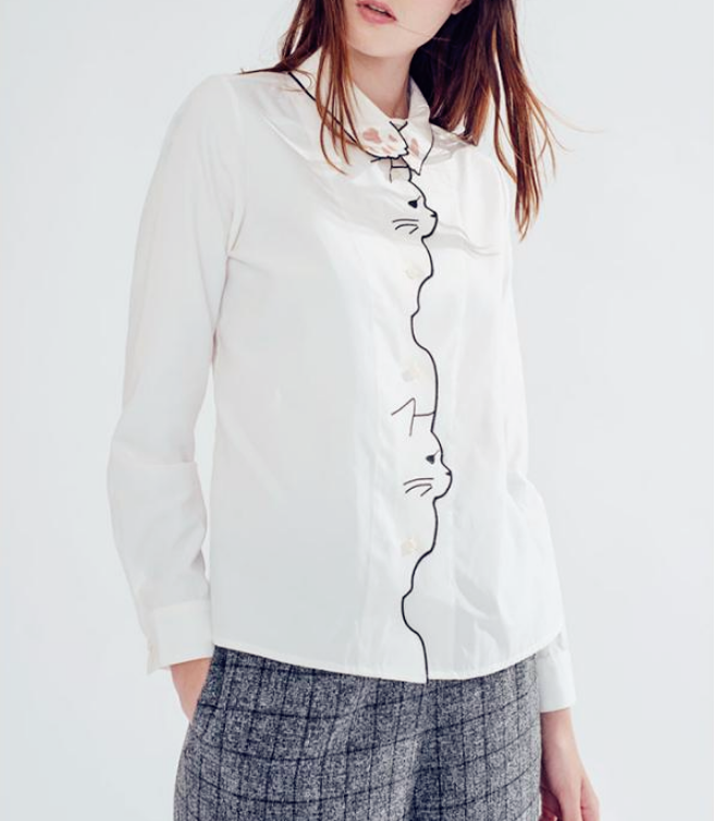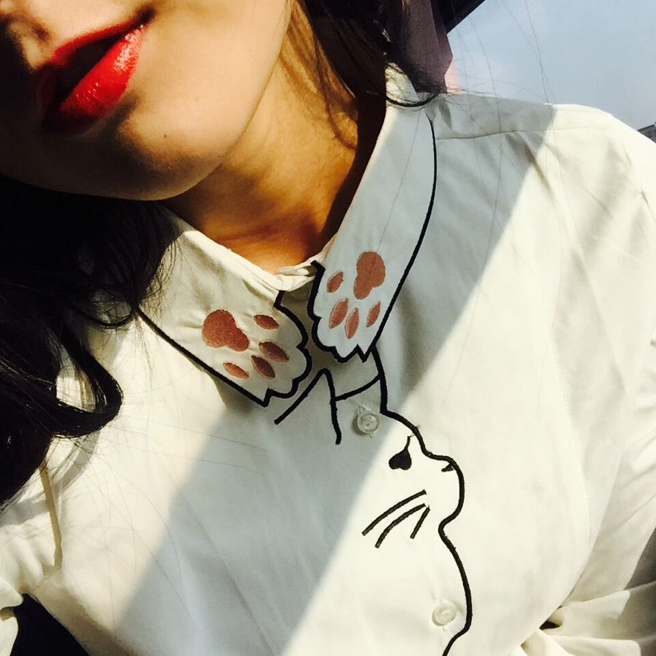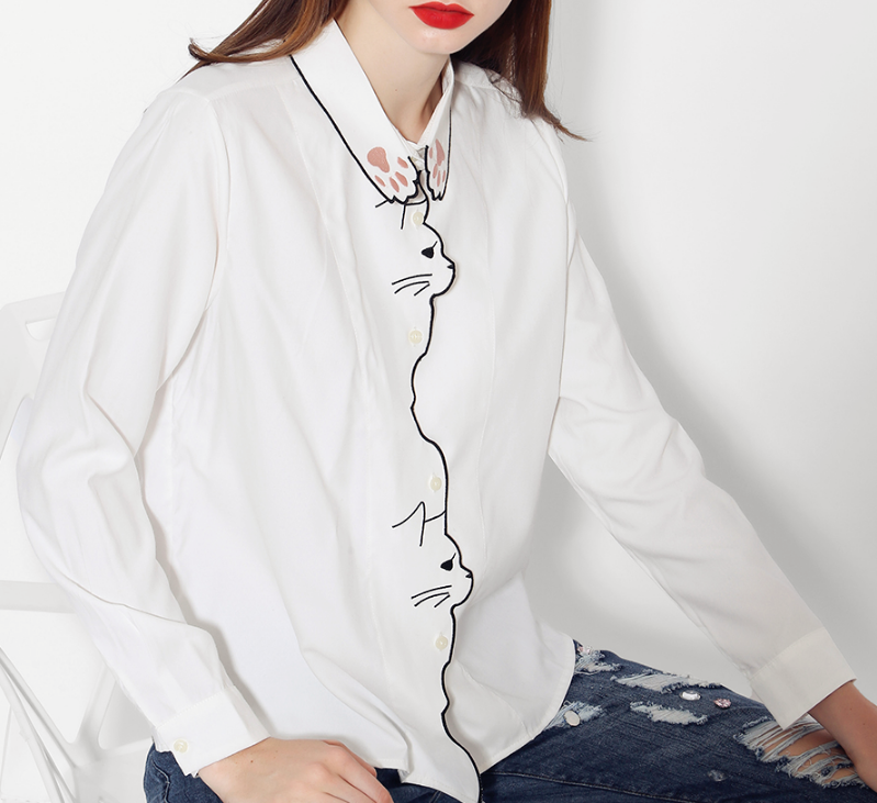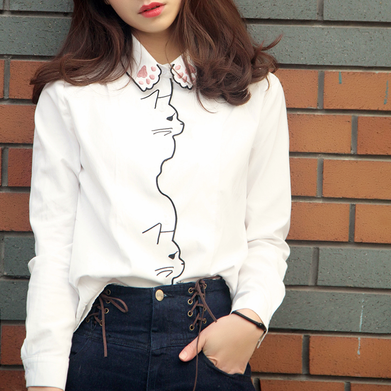 Cat Paw Embroidered Turn-down Collar Long Sleeve Blouse