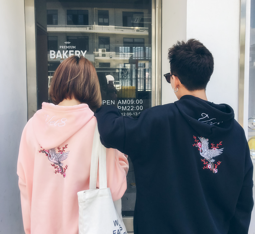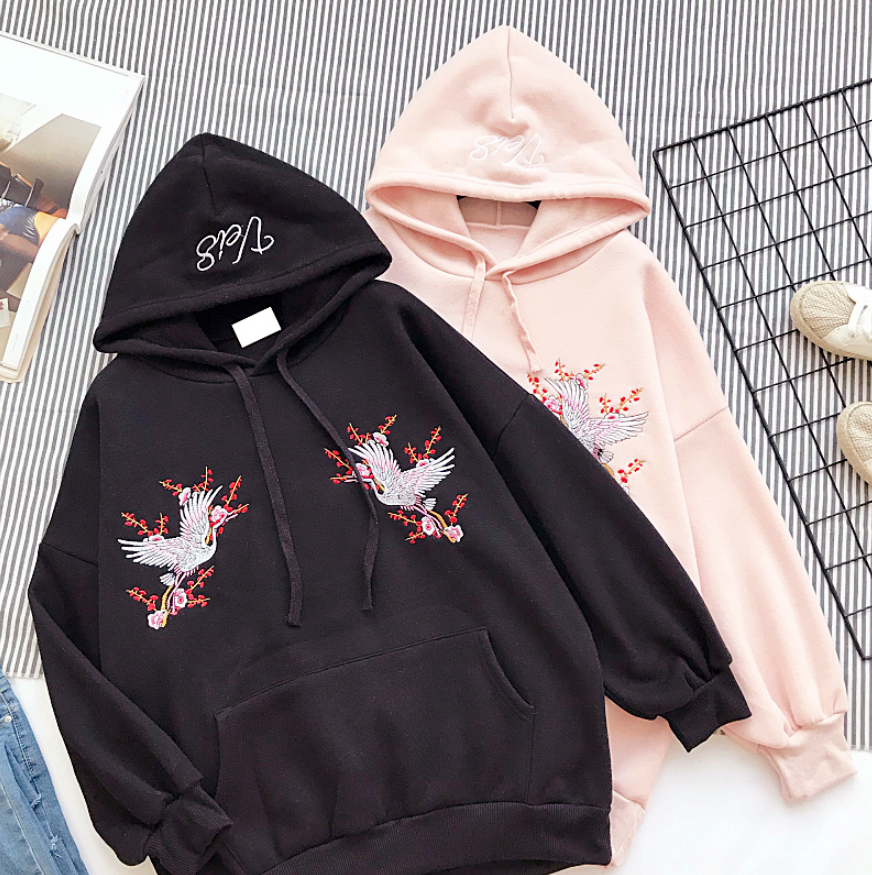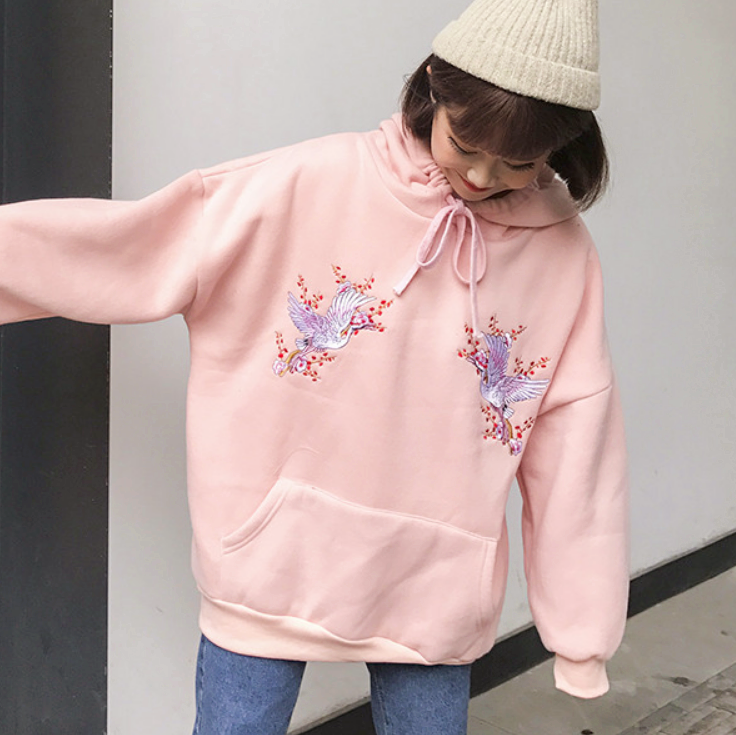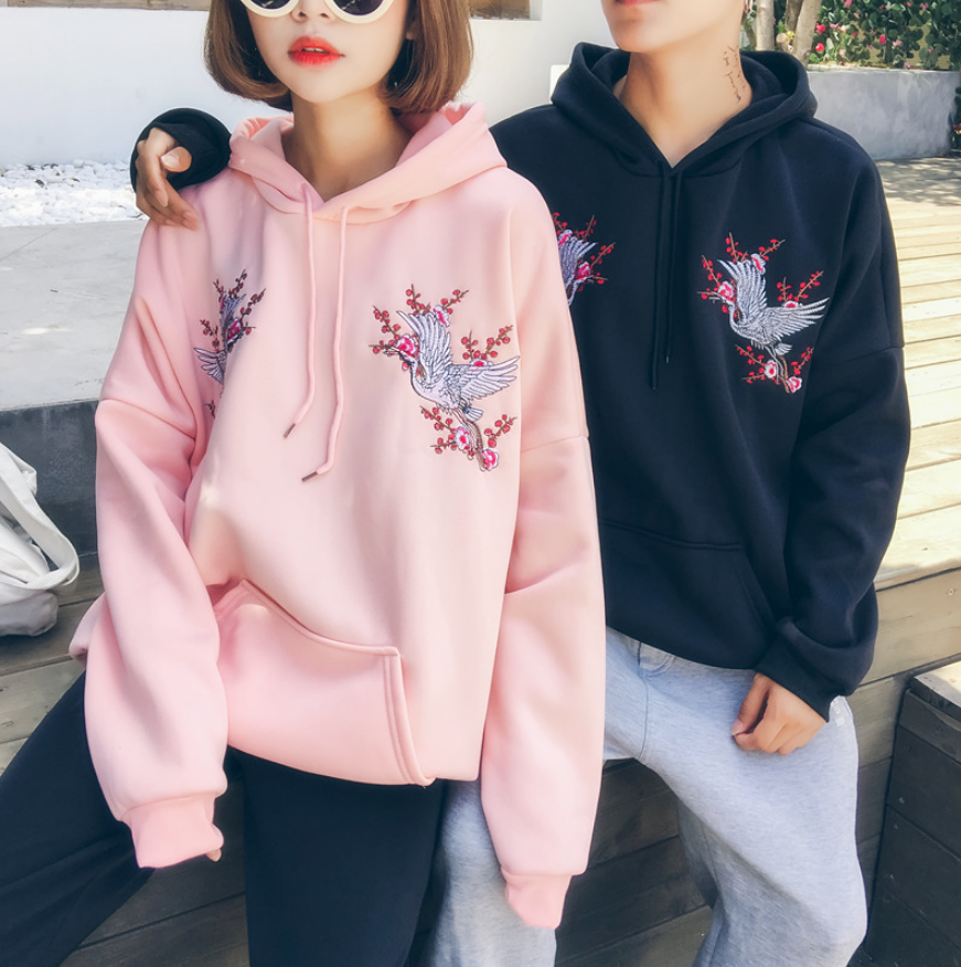 Pink / Black Crane Floral Embroidered Hoodies