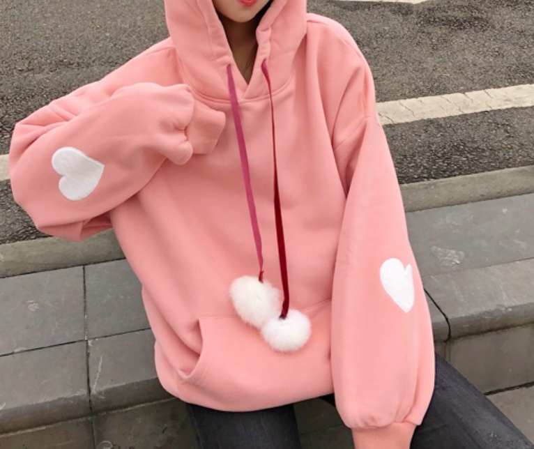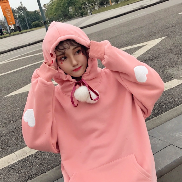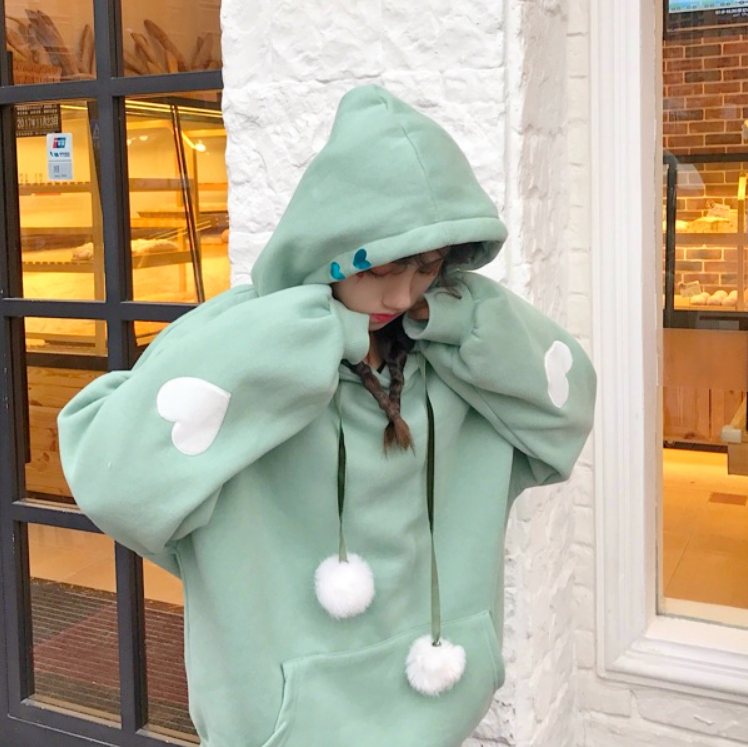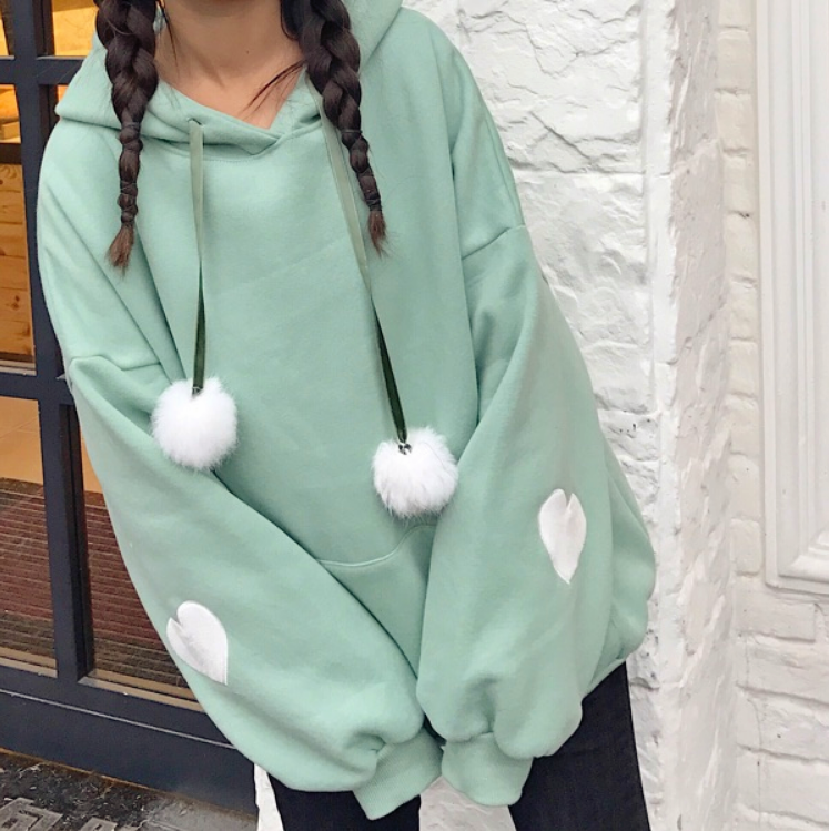 Harajuku Love Heart Embroidered Woolen Fluffy Ball Hoodie Sweatshirt