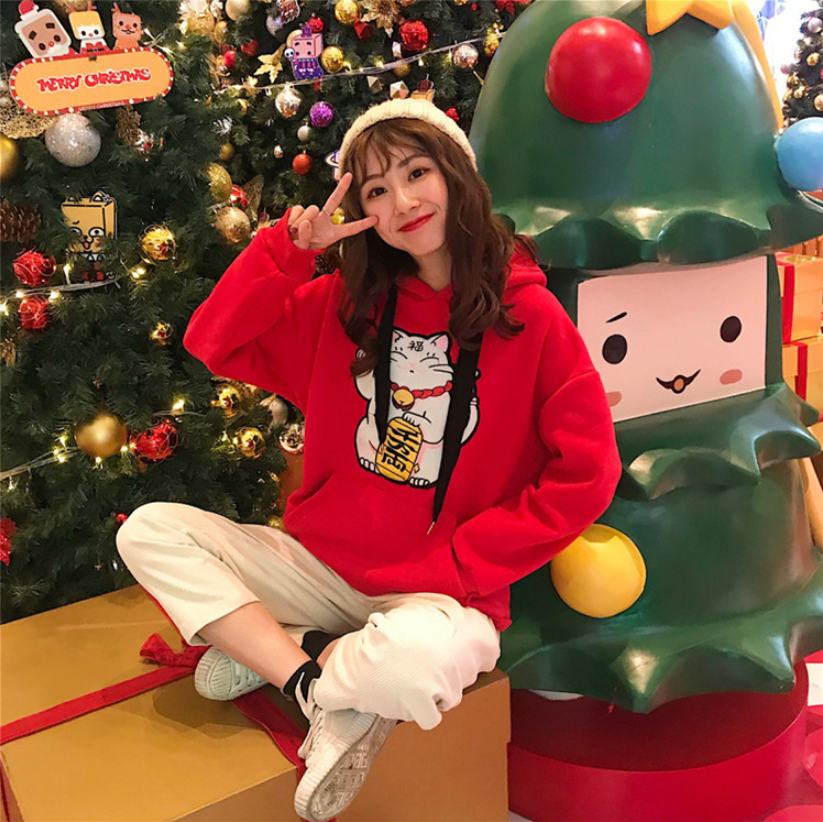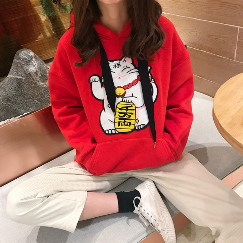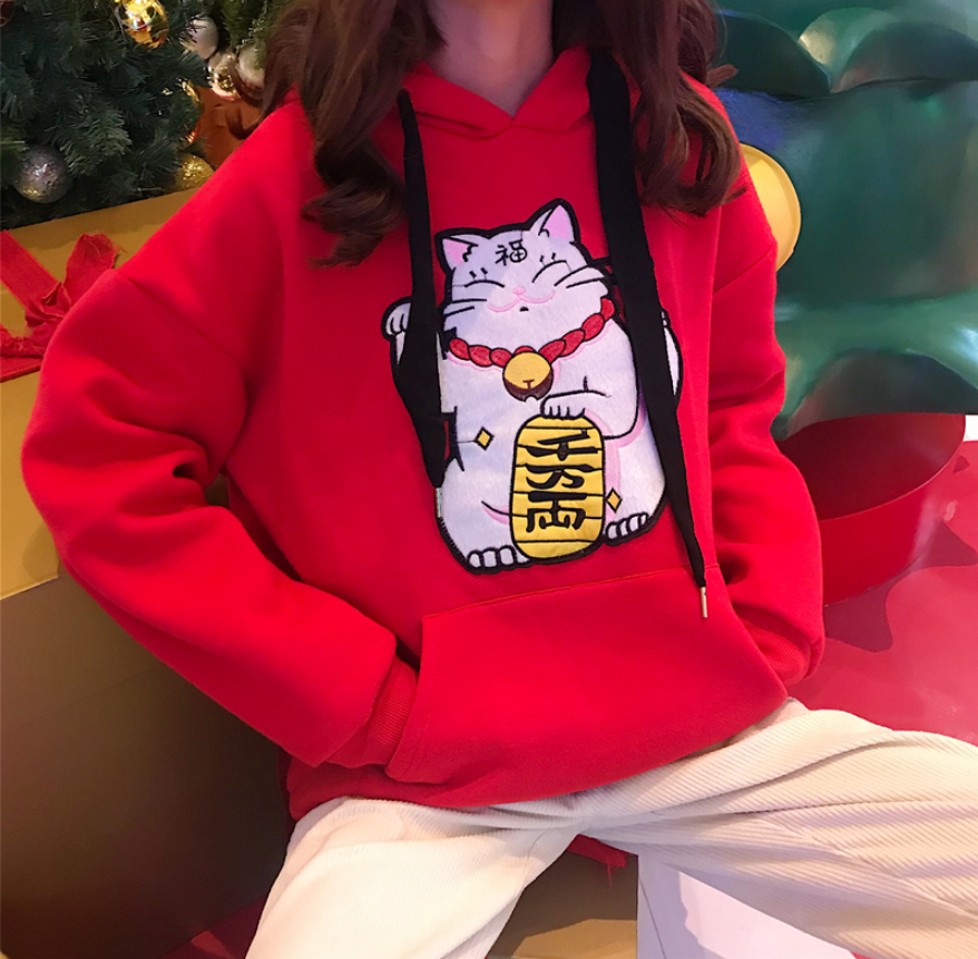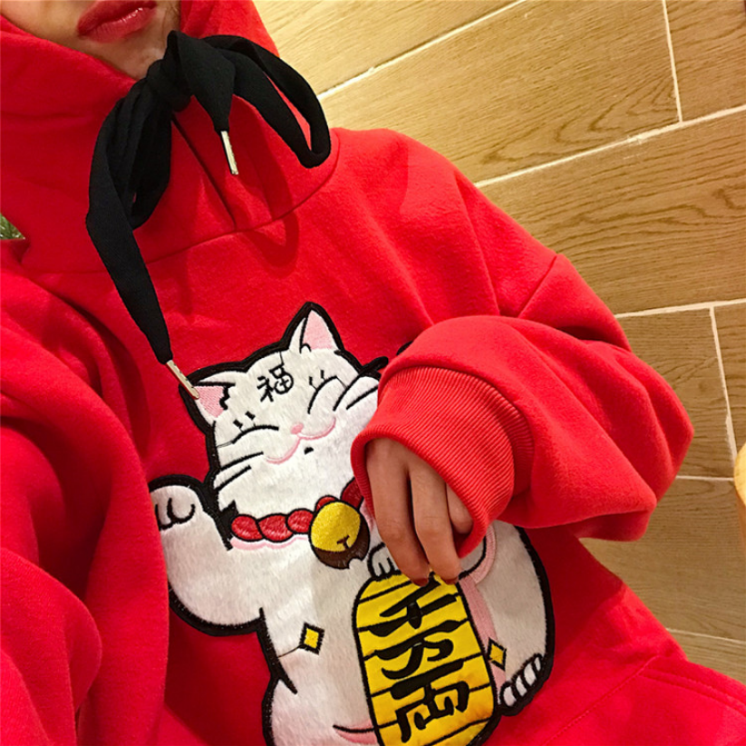 Cute Lucky Cat / Maneki Neko / Fortune Cat Embroidery Red Woolen Hoodie Sweater