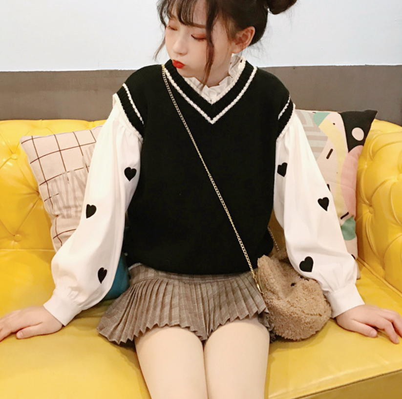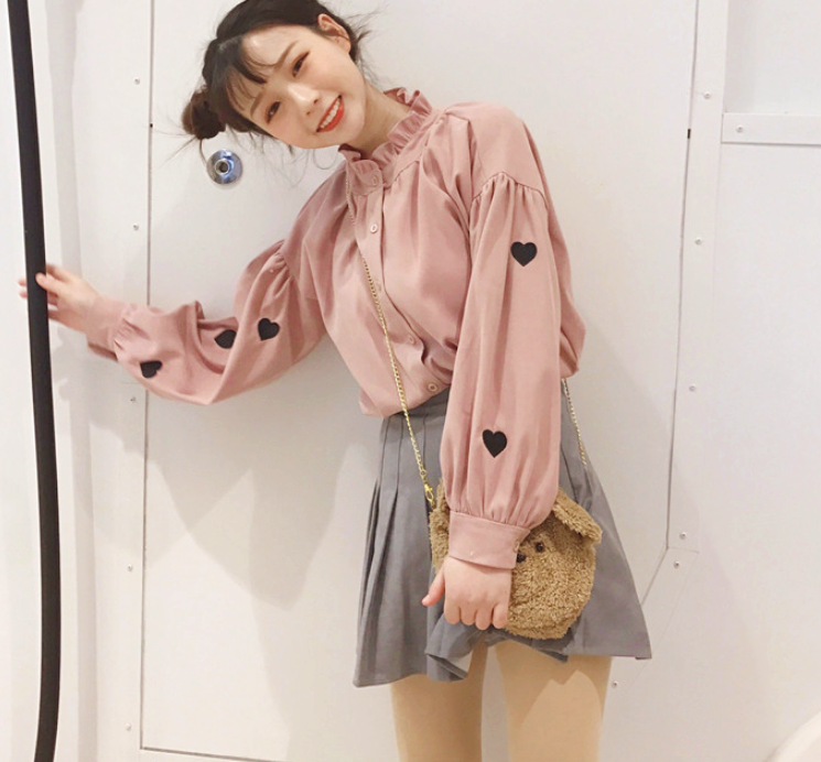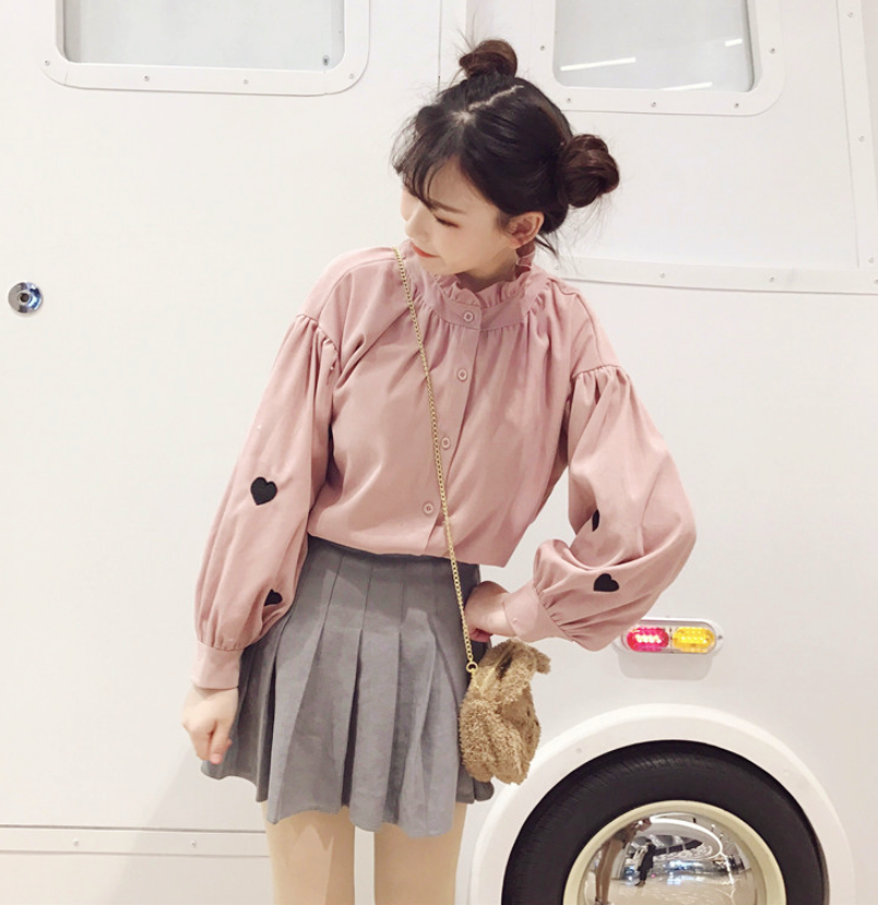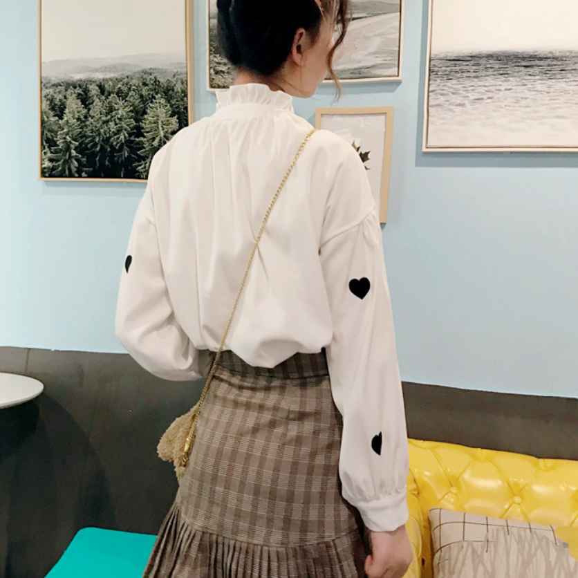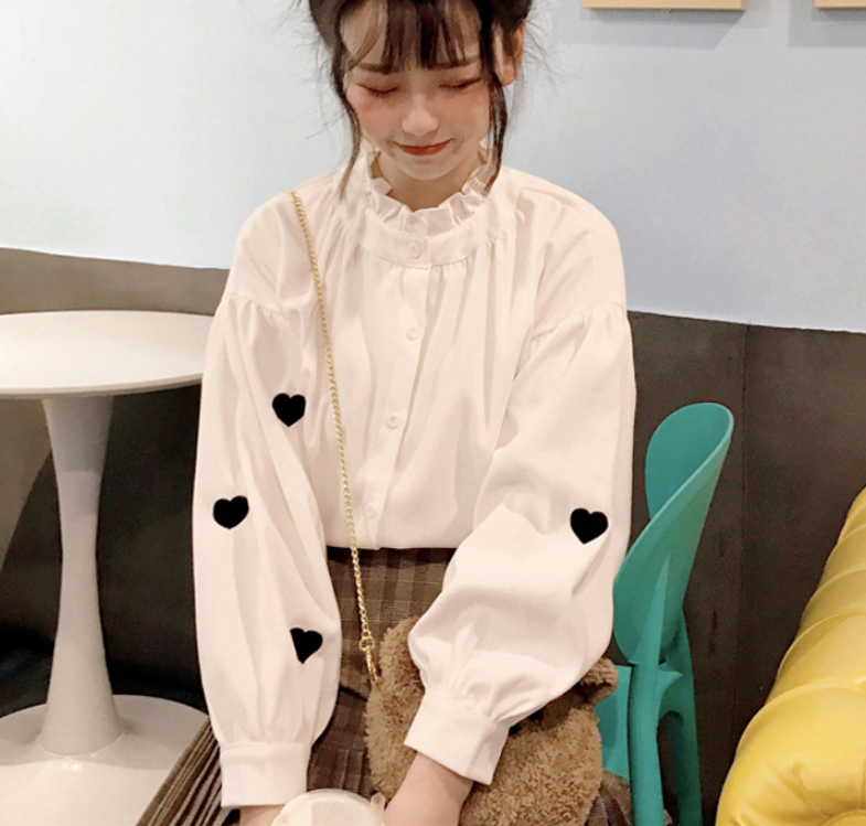 Love Heart Embroidery Flouncing Stand Collar Blouse