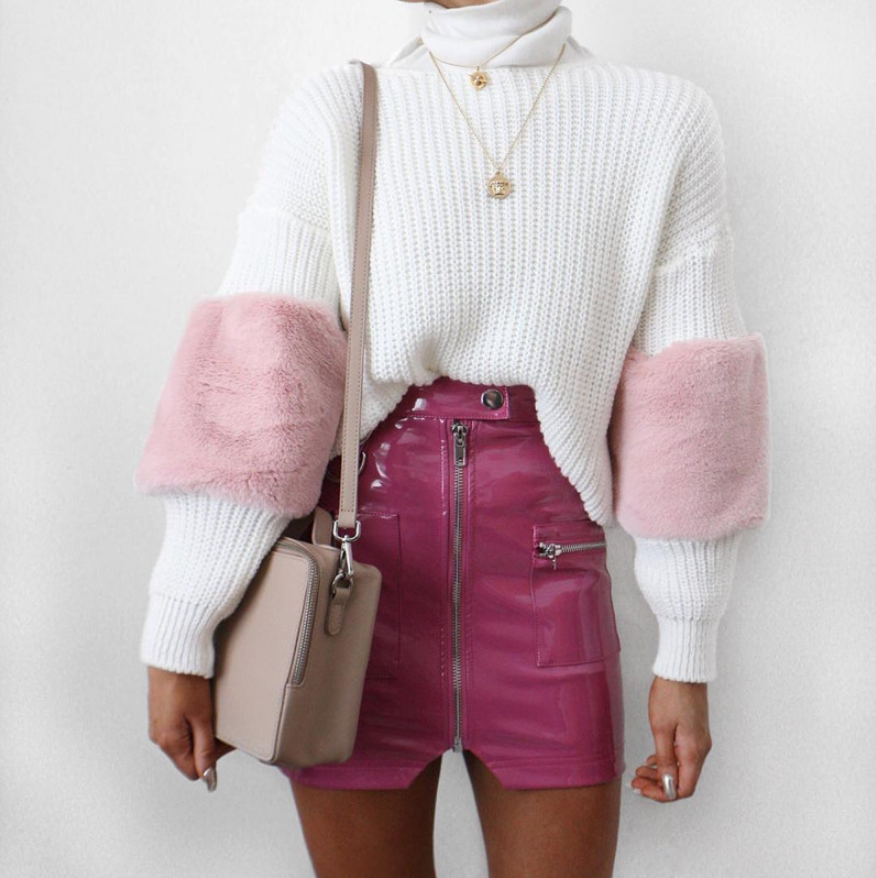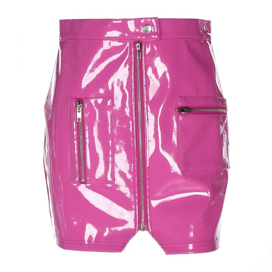 Pink Pattern Leather Pocket Zipper Pencil Skirt