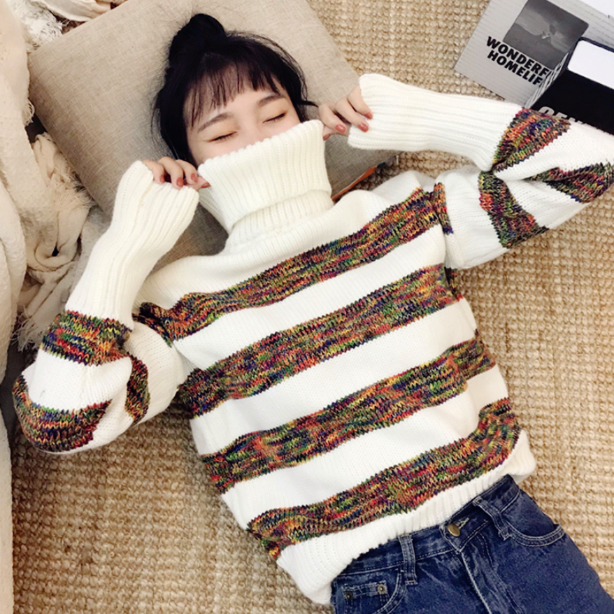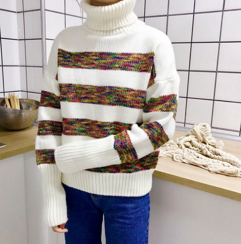 Harajuku Turtleneck Color Block Striped Thick Knitted Sweater