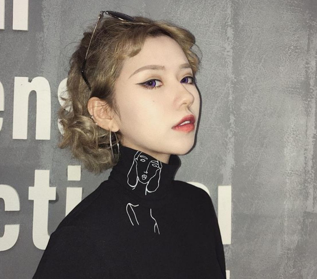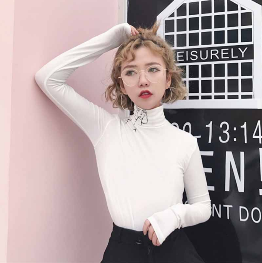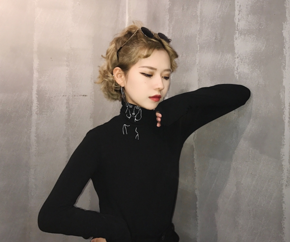 High Collar Women Face Printed Slim Long Sleeve T-shirt