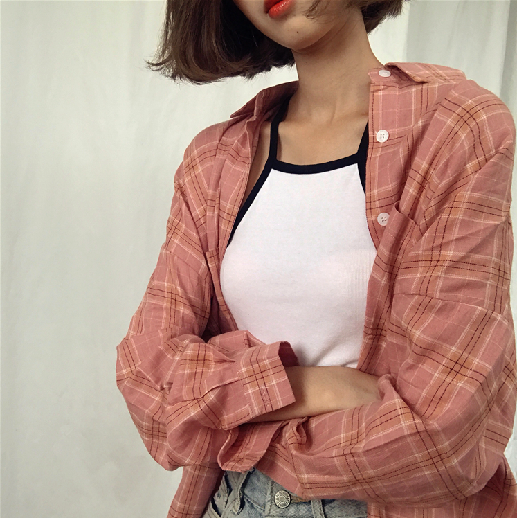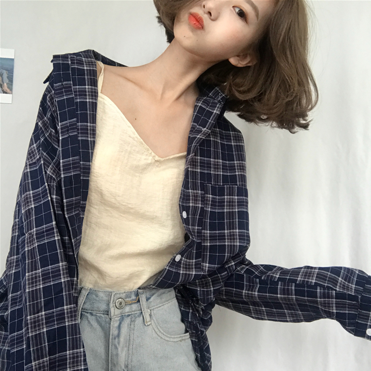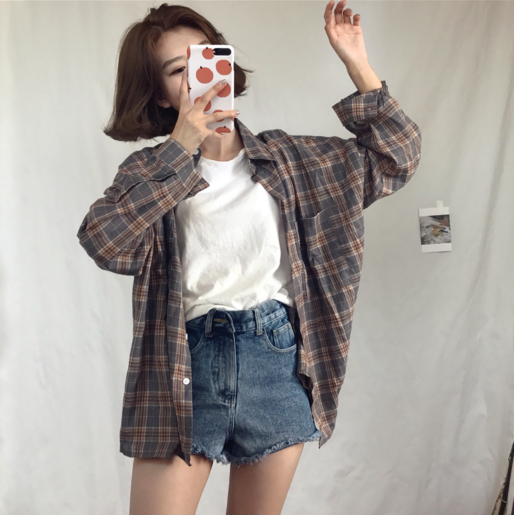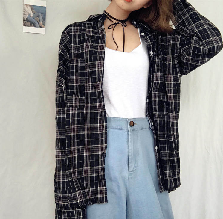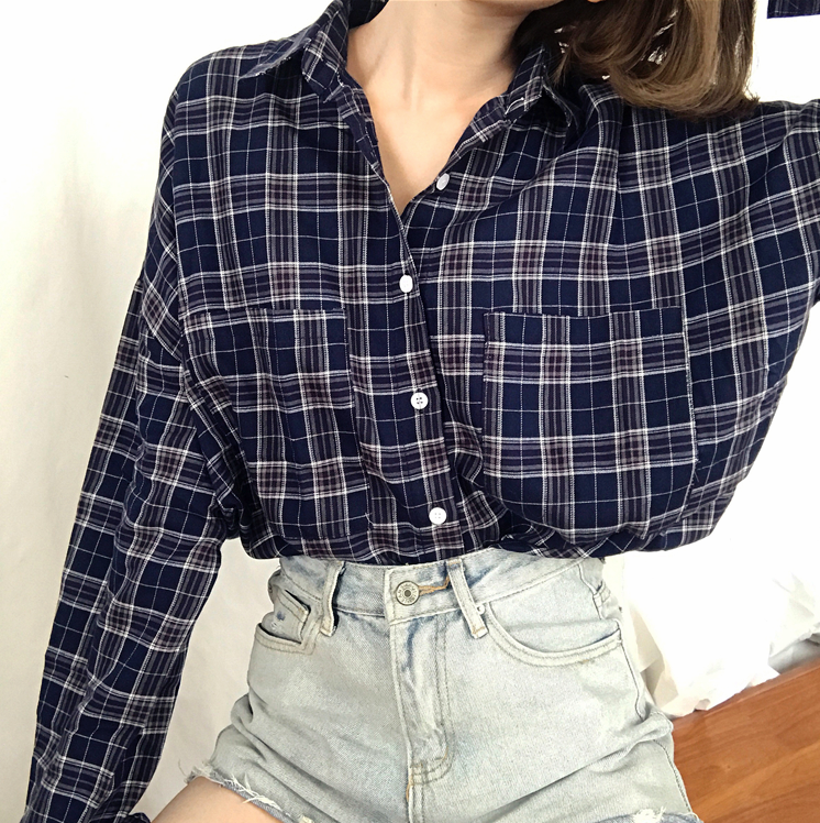 Material: cotton blend ♡Color: gray, navy blue, pink, black ♡Pattern: plaid ♡Size: free size Front Length: 68cm / 26.8in Back Length: 78cm / 30.7in Bust: 126cm / 49.6in Shoulder: 66cm / 26in Sleeve: 47cm / 18.5in