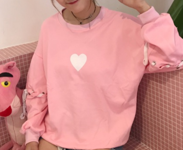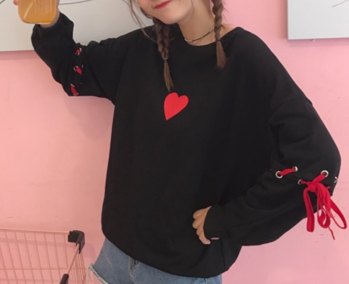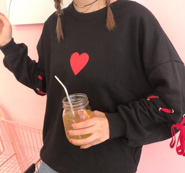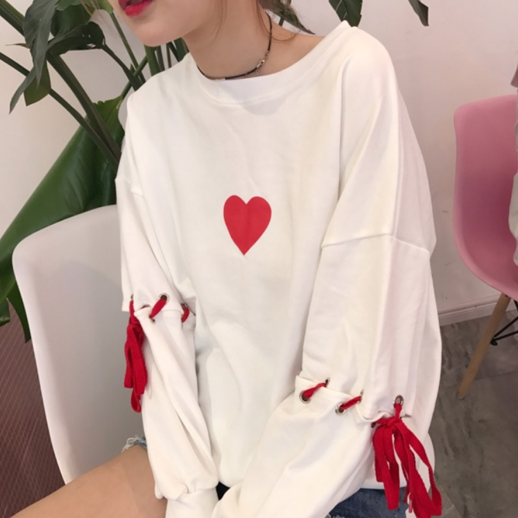 Kawaii Heart Printed Lace up Tie Long Sleeve Sweatshirt