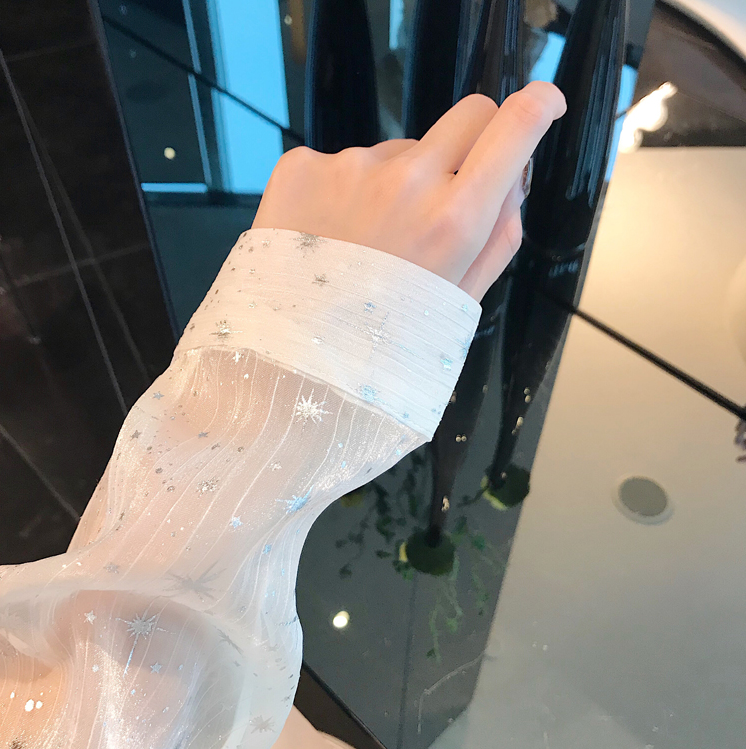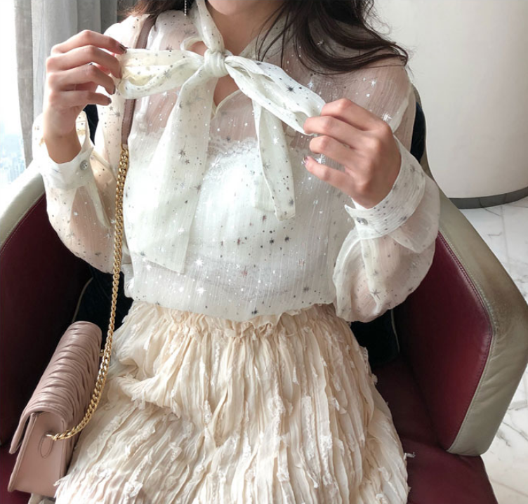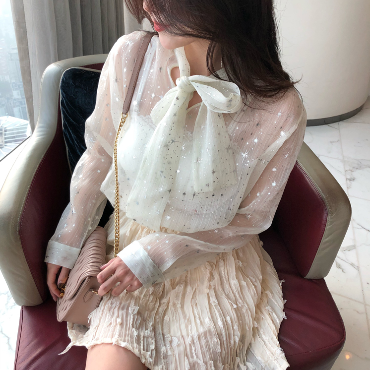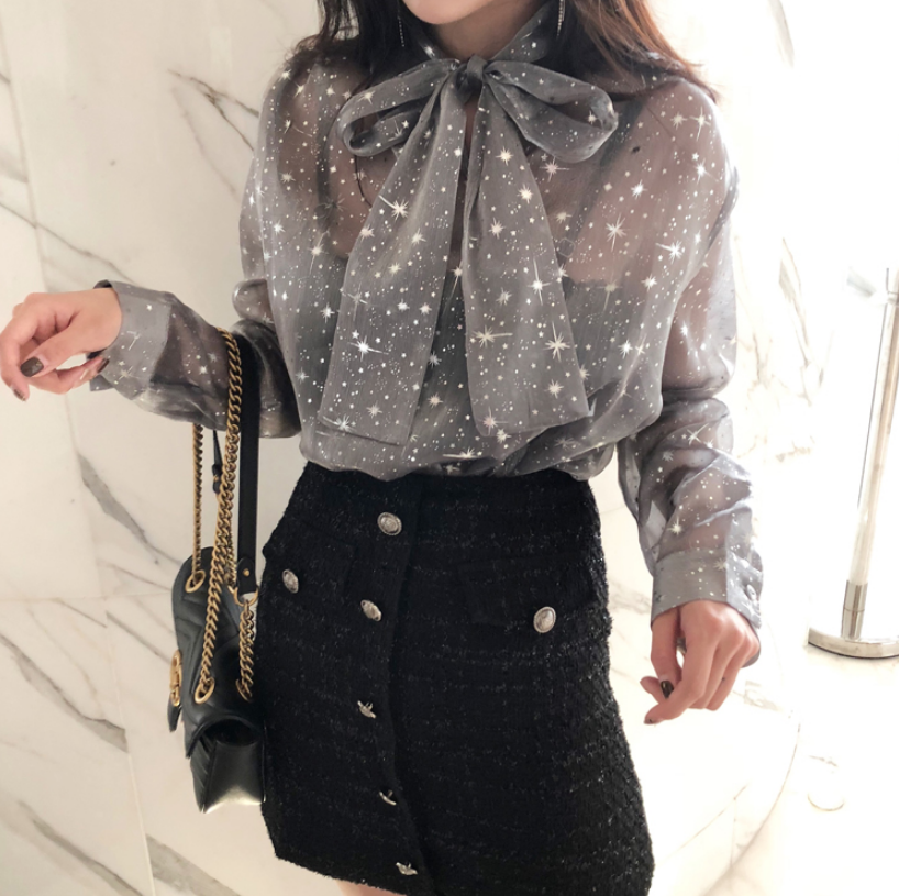 Chic Shiny Stars See-through Lace up Bow Blouse