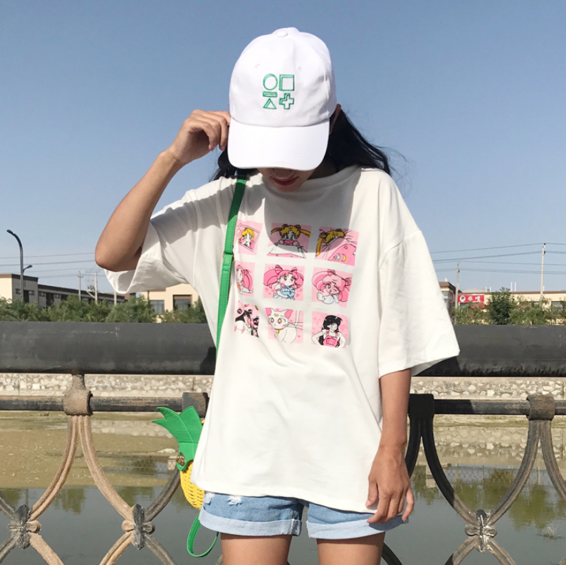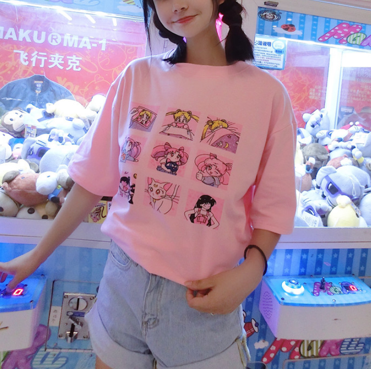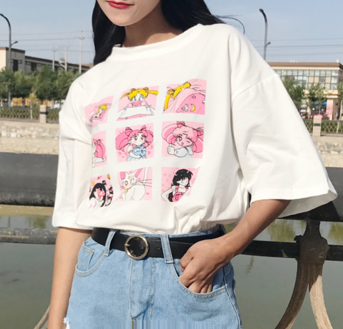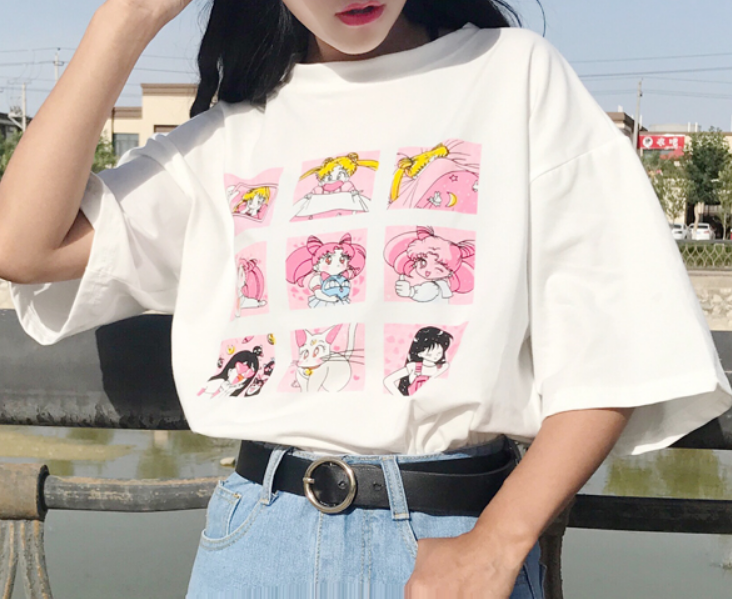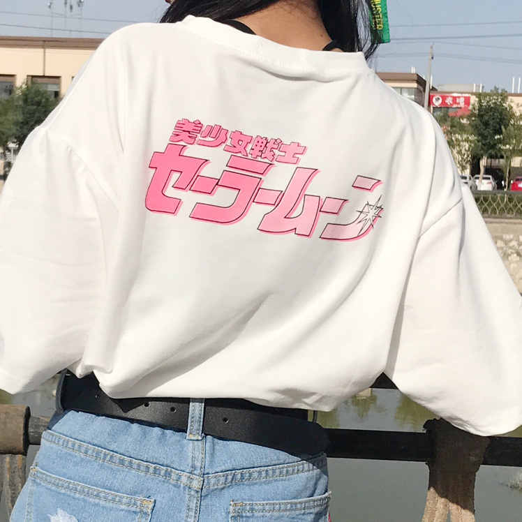 ♡Color: white, pink ♡Style: print ♡Size: Length: 68cm / 26.8in Bust: 105cm / 41.3in Shoulder: 47cm / 18.5in Sleeve: 23cm / 9.1in