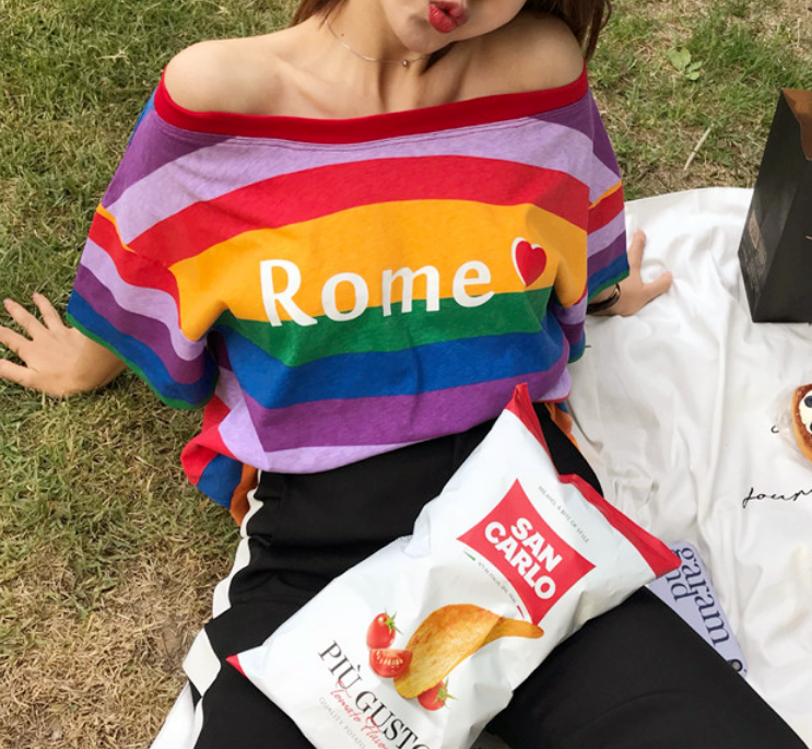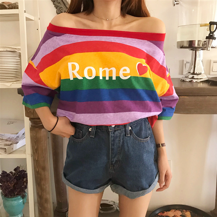 Rome Heart Printed Off Shoulder Rainbow Stripe Tee