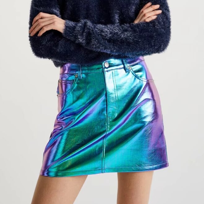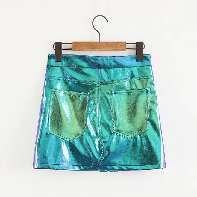 Iridescent Hologram Pocket PU Leather Pencil Skirt