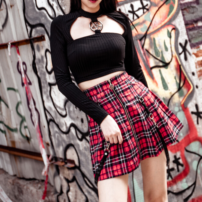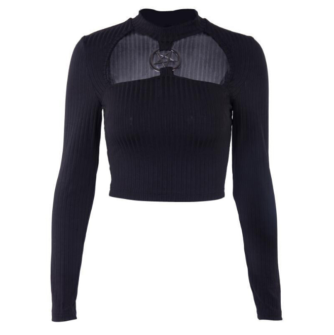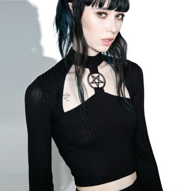 Cyber Punk Pentagram Pendant Hollow Out Black Crop Top