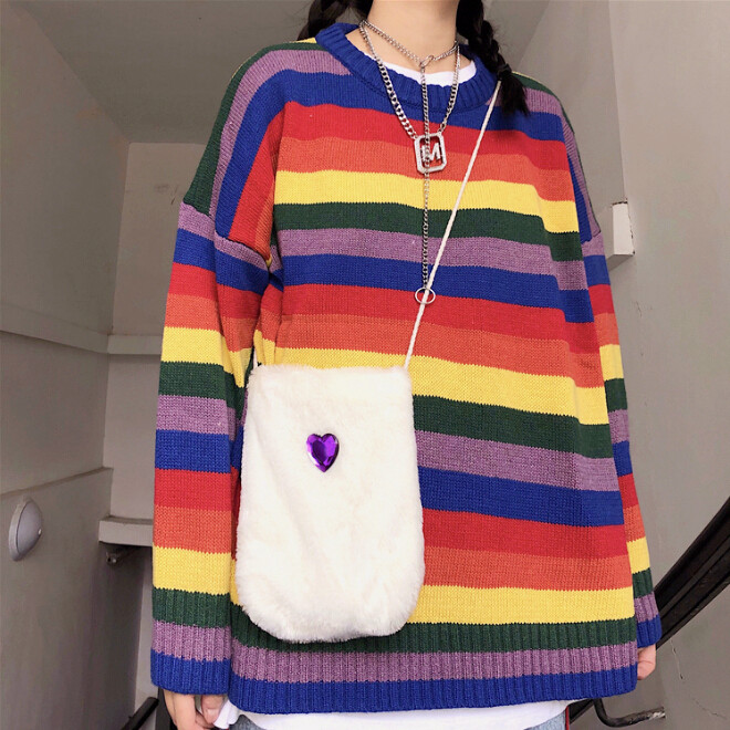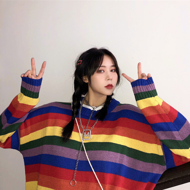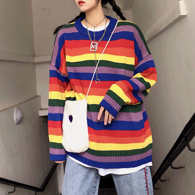 ♡Color: colorful ♡Style: stripe; ♡Size: Length: 67cm / 26.4in; Bust: 134cm / 52.8in; Shoulder: 72cm / 28.3in; Sleeve: 43cm / 16.9in;