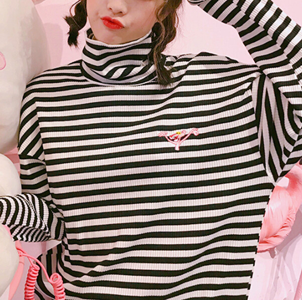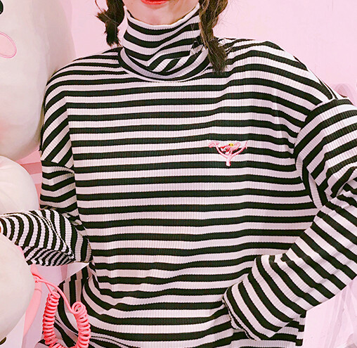 Pink Leopard Embroidered High Collar Stripe T-shirt