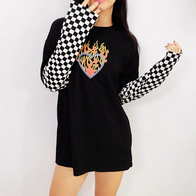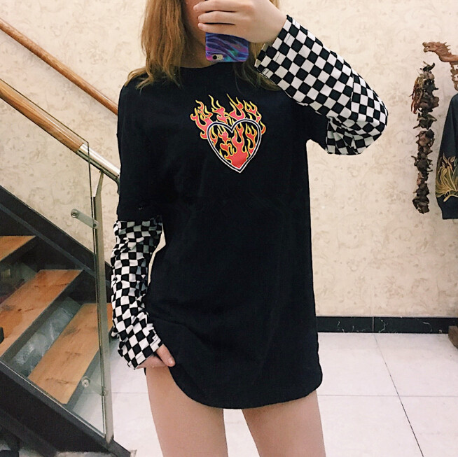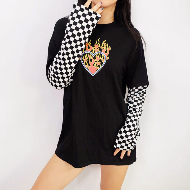 Cyber Punk Flame Heart Print Checks Long Sleeve T-Shirt