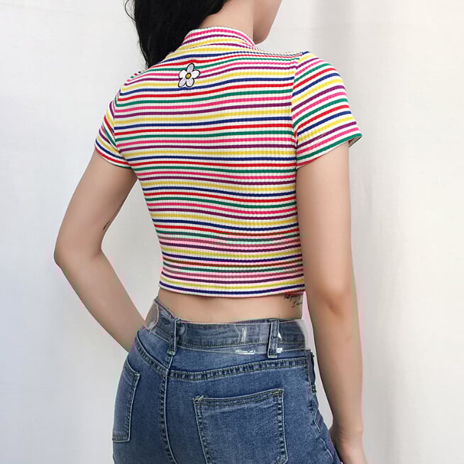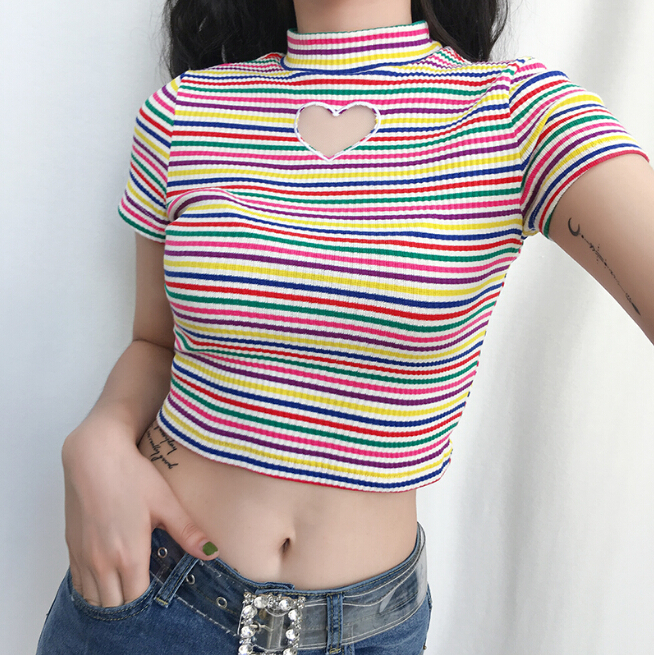 Hollow out Heart Rainbow Stripe Flower Embroidered Top