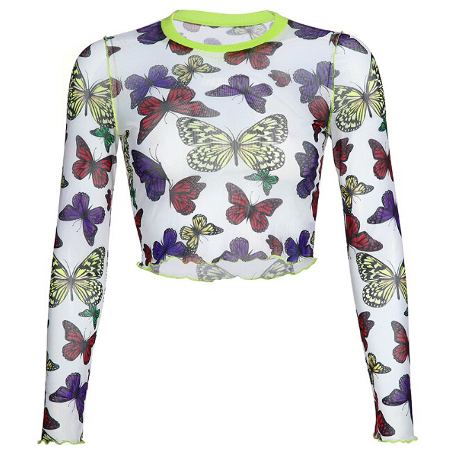 See-through Butterfly Printed Long Sleeve Mesh Top