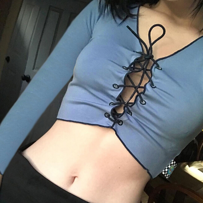 Sexy Lace up Pastel Blue Long Sleeve Top