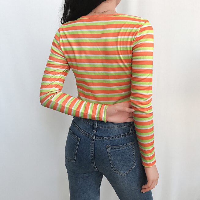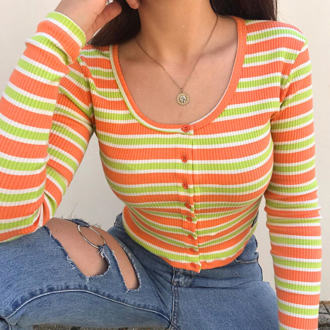 Orange Green Color Block Stripe Button Long Sleeve Top