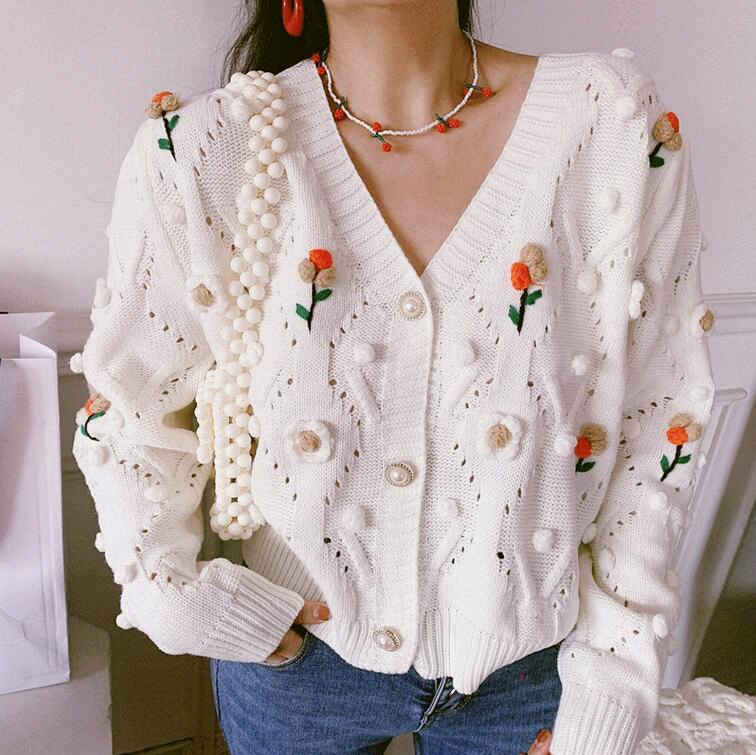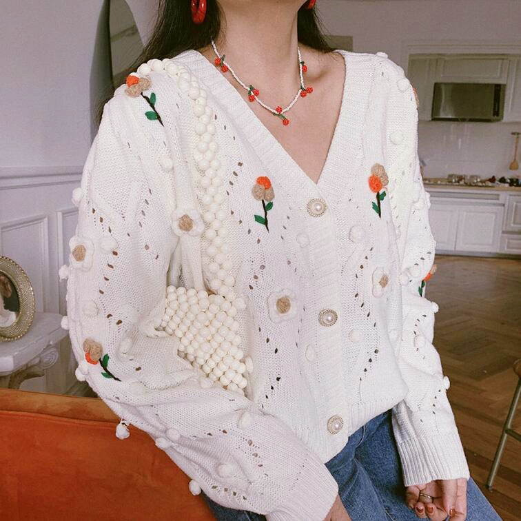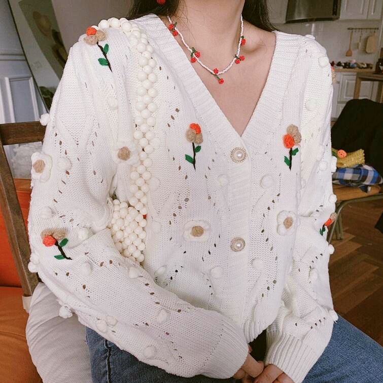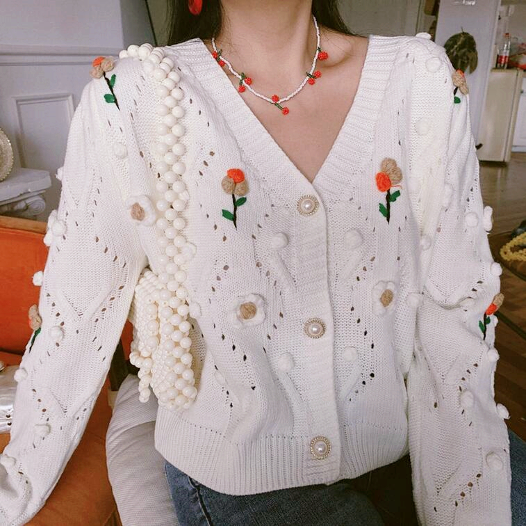 Handmade Floral Flower Embroidery Hollow Out Knit Cardigan