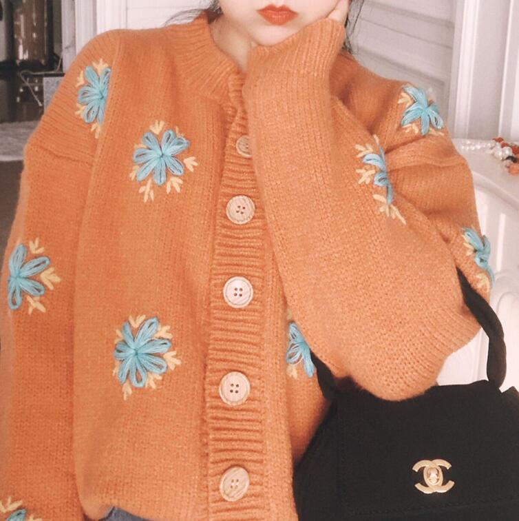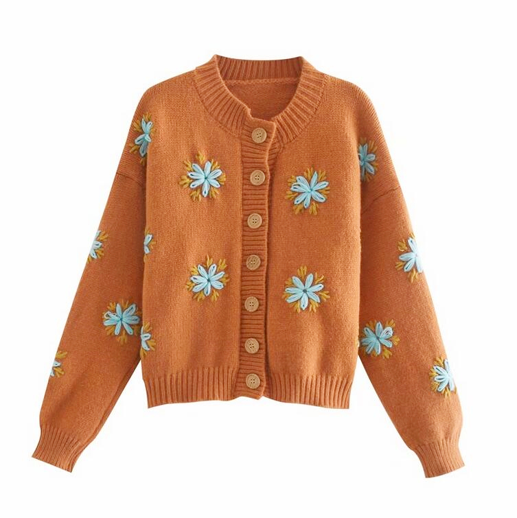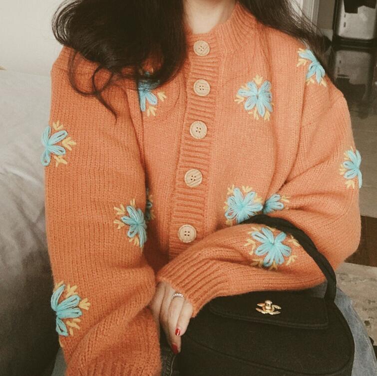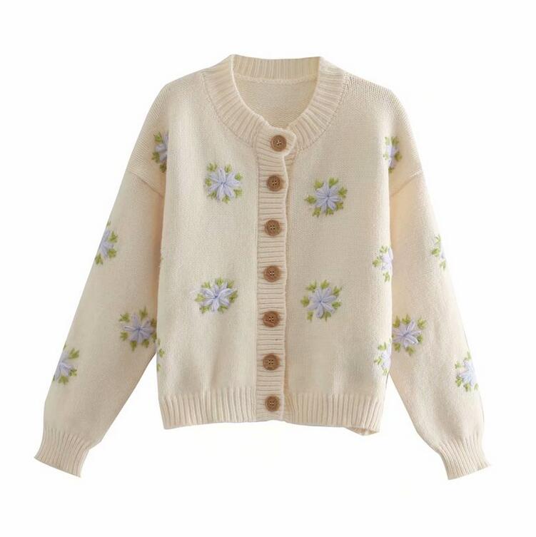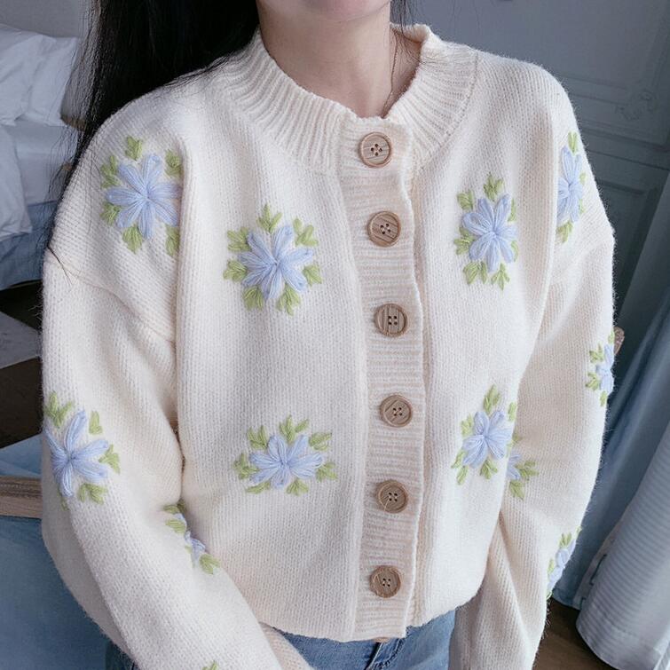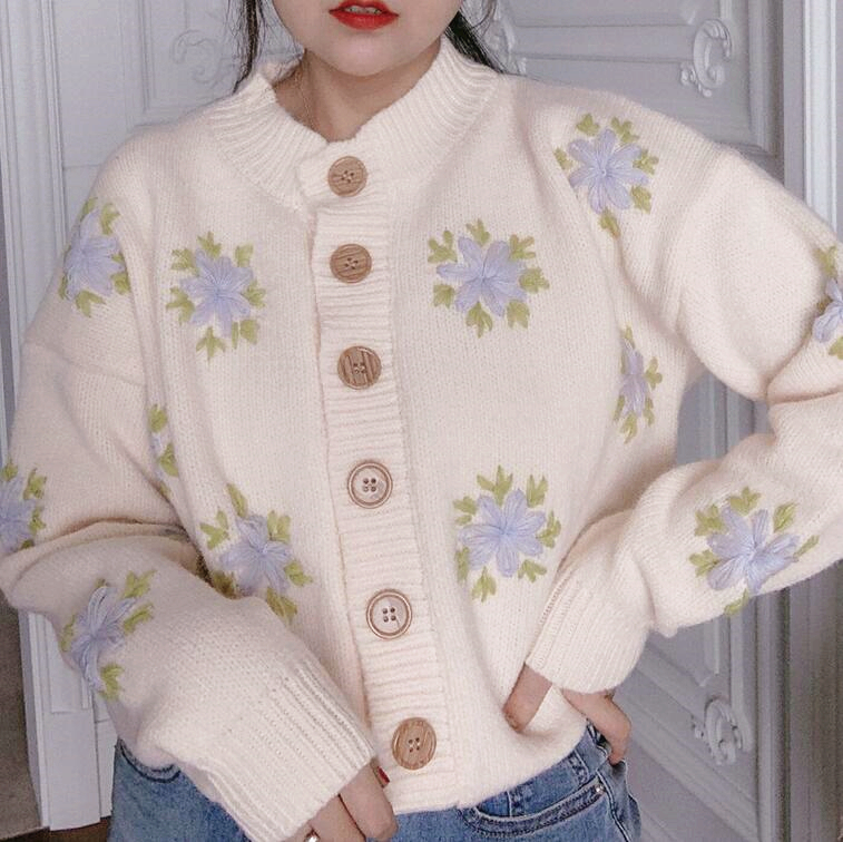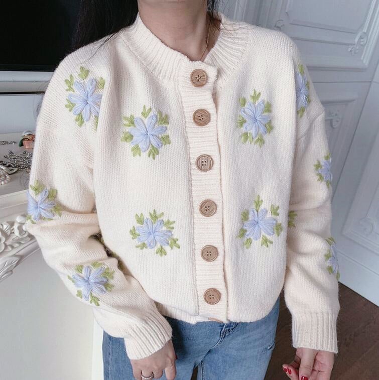 Vintage Floral Flower Embroidery Button Sweater Knit Cardigan