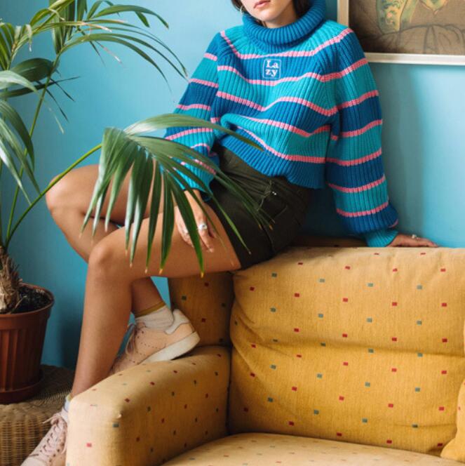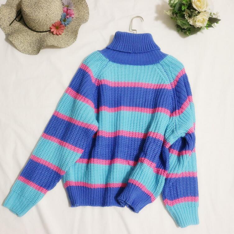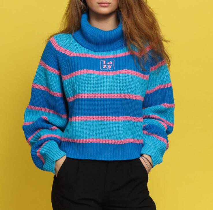 Lazy High Collar Blue Color Block Stripe Jumper Sweater