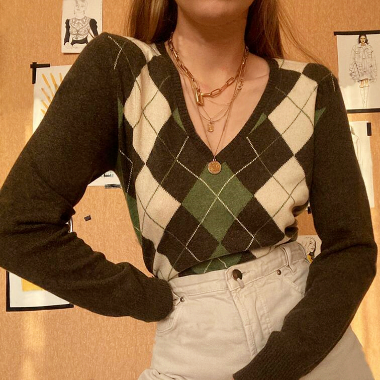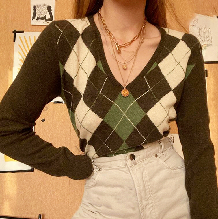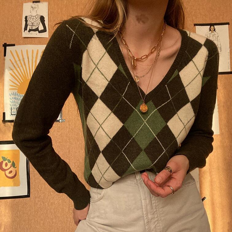 V-neck Color Block Rhombic Diamond Knitted Sweater