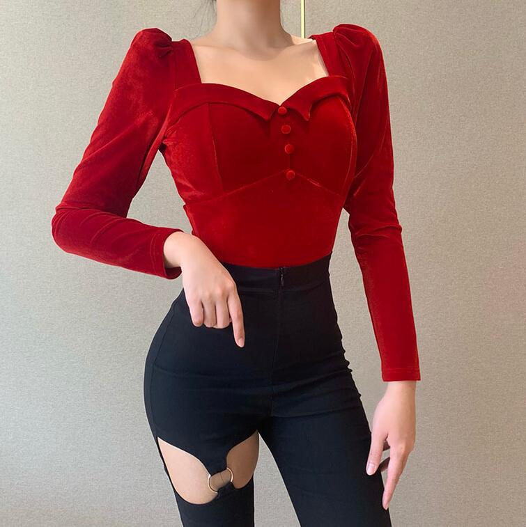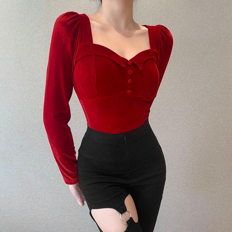 Square Collar Christmas Red Velvet Long Sleeve T-shirt