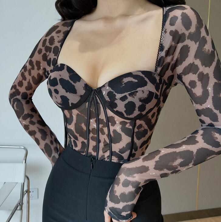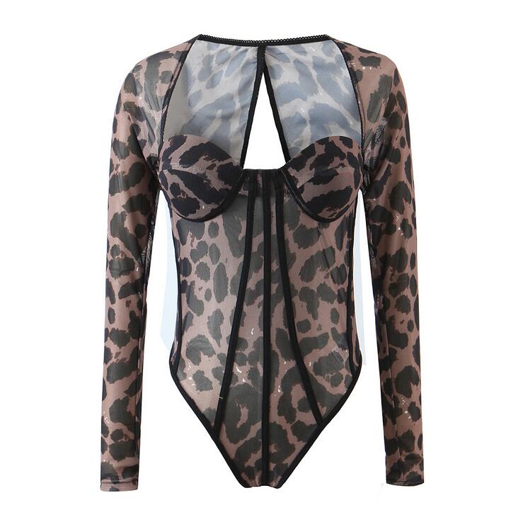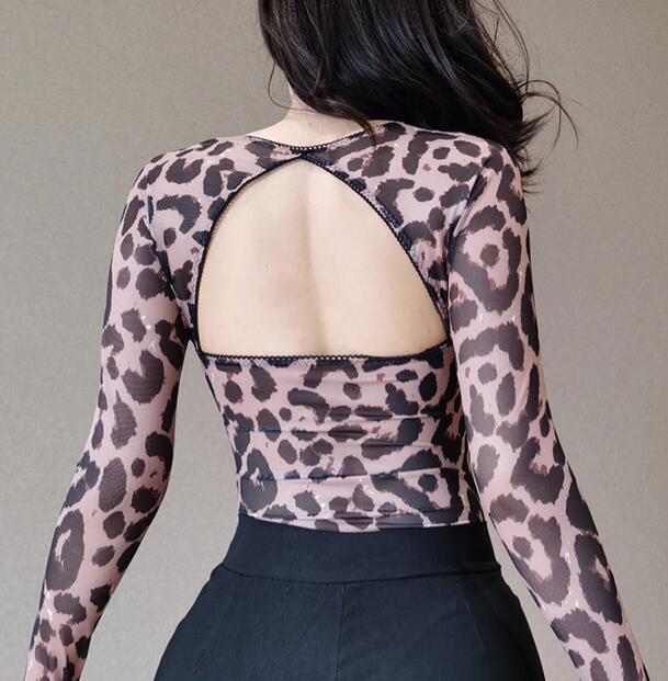 Leopard Print Mesh Long Sleeve Backless One-piece T-shirt