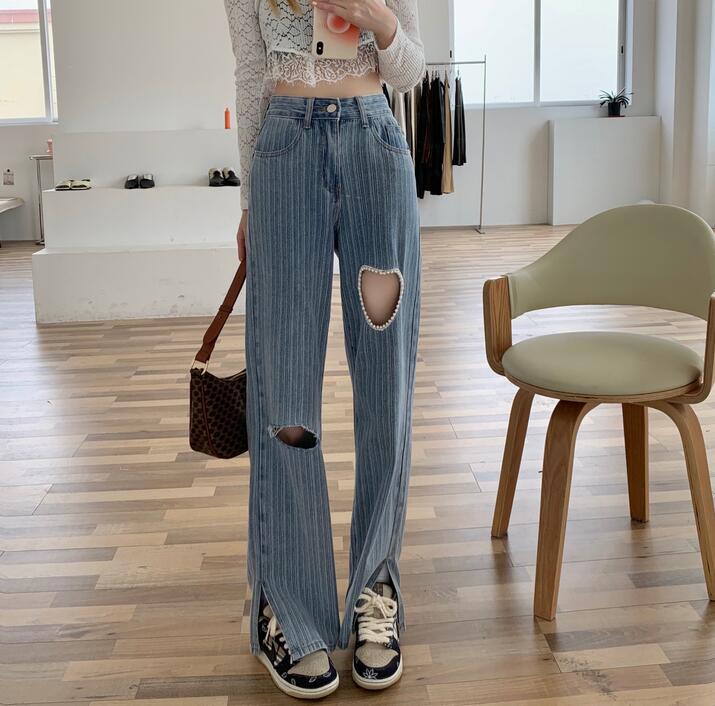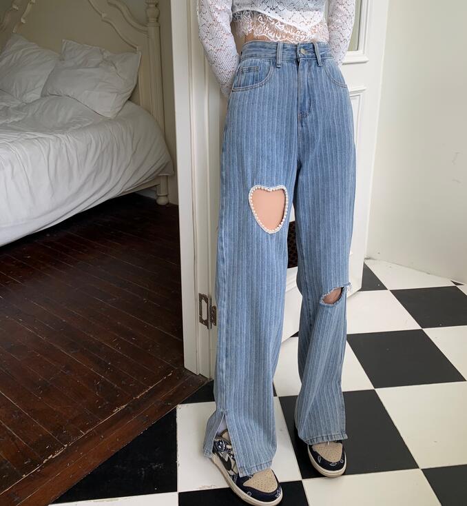 Pearl Heart Ripped Split Flare Bell Bottom Jeans Denim Pants