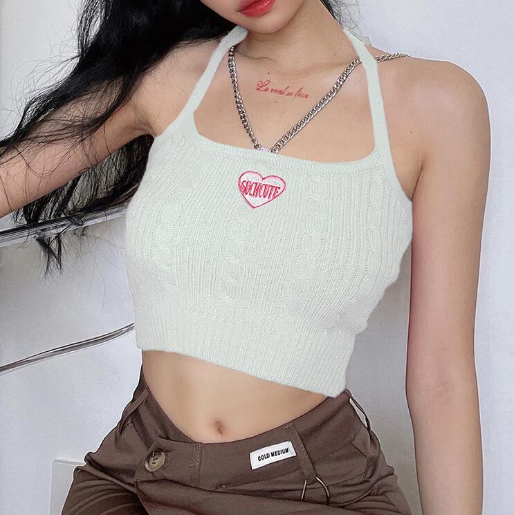 SUCH CUTE HEART EMBROIDERY CHAIN SLING KNIT CAMI TOP