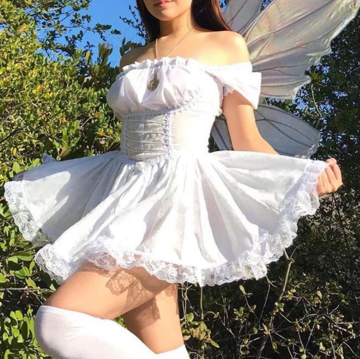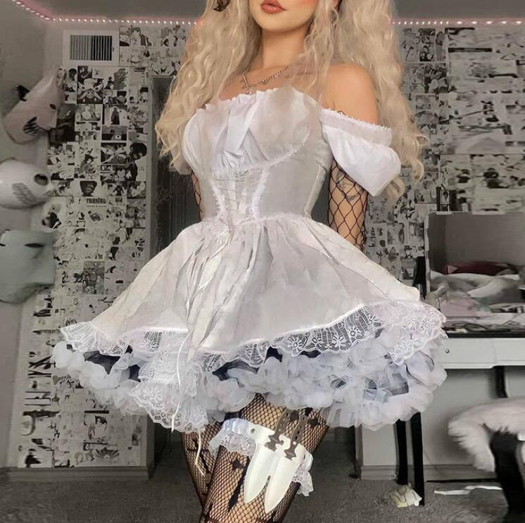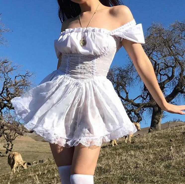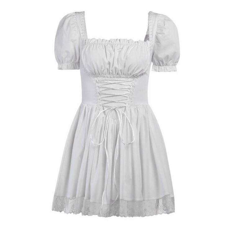 Sweet Square Collar Strap Cross Puff Sleeve White Lace Dress