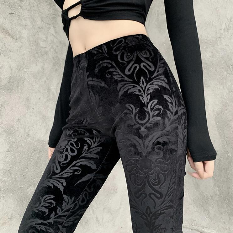 High Waist Floral Flower Print Black Velvet Flare Pants