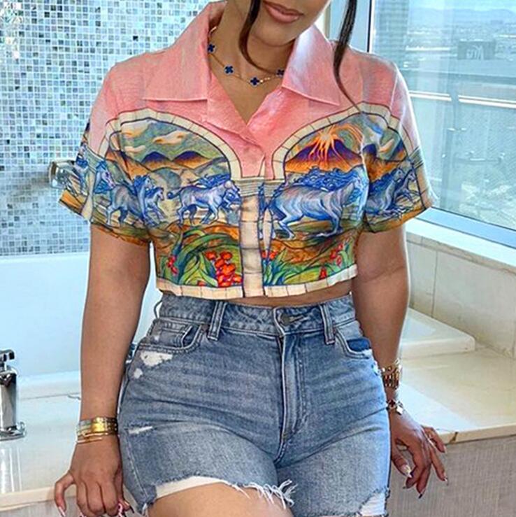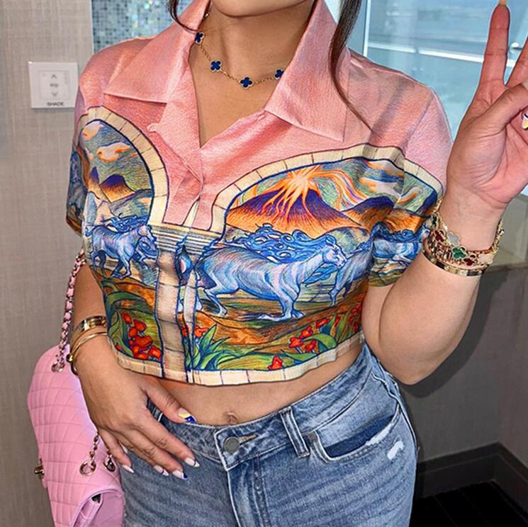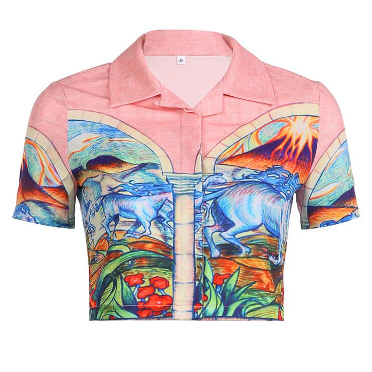Vintage Pink Turndown Collar Horse Printed Shirt